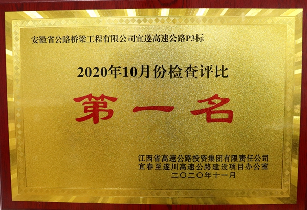 近日,江西省高速集團(tuán)宜遂項(xiàng)目辦下發(fā)關(guān)于表彰十月份檢查評(píng)比先進(jìn)單位的通報(bào)文件,公司承建的宜遂高速P3標(biāo)在綜合檢查評(píng)比中表現(xiàn)優(yōu)秀,榮獲路面單位第一名。