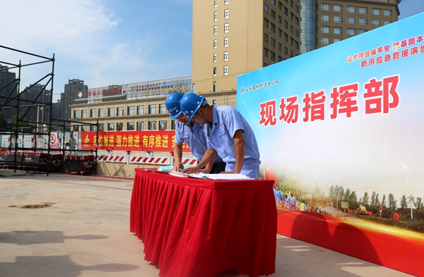 此次演練背景為多日連續(xù)降雨造成施工現(xiàn)場基坑積水,嚴(yán)重影響基坑穩(wěn)定和施工人員人身安全。在積水超過警戒水位后,項(xiàng)目部應(yīng)急救援領(lǐng)導(dǎo)小組立即啟動(dòng)應(yīng)急預(yù)案,開展應(yīng)急救援工作。演練按預(yù)警報(bào)告、集合分工、基坑監(jiān)測、筑壩攔水、快速排水、醫(yī)療救助和匯報(bào)總結(jié)等流程進(jìn)行。參演人員分成警戒保衛(wèi)、醫(yī)療救護(hù)、技術(shù)指導(dǎo)、物資供應(yīng)、現(xiàn)場搶險(xiǎn)五個(gè)小組,按照預(yù)案,提前演練、各司其職、密切配合,確保了防汛應(yīng)急救援演練活動(dòng)順利完成。