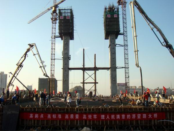 淠望路大橋主橋邊跨長85m,砼方量約2800m³,鋼筋約120t。為緊緊抓住秋季黃金施工季節(jié),趕在冬季來臨之前完成更多的生產(chǎn)任務(wù)。項目部經(jīng)認(rèn)真研究、周密論證,決定將原計劃分兩次澆筑的85m邊跨改為一次性澆筑,方量之大在公司歷史上尚屬首次。命令一下,項目部群情激昂、精神振奮、上下一心、紛紛卯足了干勁、準(zhǔn)備大干一把。項目部管理人員全體出動齊上陣,幫助工人穿拉鋼絞線;人員組織、材料設(shè)備安排、質(zhì)量控制、施工力量組織、后勤保障等工作科學(xué)周密、井然有序的迅速落實到位。公司領(lǐng)導(dǎo)更是高度重視,專門為這次大方量砼澆筑在現(xiàn)場召開了生產(chǎn)調(diào)度會,副總經(jīng)理彭申凱、總經(jīng)理助理傅月斌、副總工程師崔林釗等親自到現(xiàn)場督戰(zhàn)。公司還緊急抽調(diào)了合肥市政項目和金桃大橋項目的精兵強將前來鼎力“助陣”。
