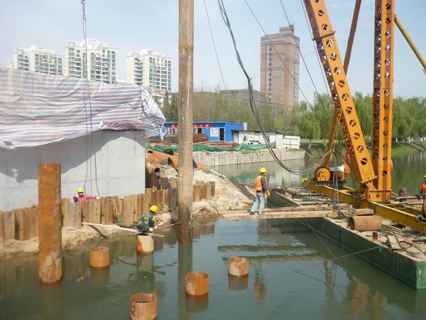 項(xiàng)目部自3月13日開打河中鋼管樁以來,克服了合肥市連續(xù)陰雨天氣和南淝河生態(tài)補(bǔ)水的影響,并努力克服了夜間不能作業(yè)的影響,在異常緊迫的工期壓力下,于4月初完成右半幅一百多根鋼管樁的打設(shè)作業(yè)。并在右半幅貝雷架架設(shè)完成后,開始進(jìn)行左半幅鋼管樁的打設(shè)作業(yè)。目前河中鋼管樁和承臺鋼管樁打設(shè)已經(jīng)全部完成,下一步,項(xiàng)目部將進(jìn)行左半幅滿堂架施工。