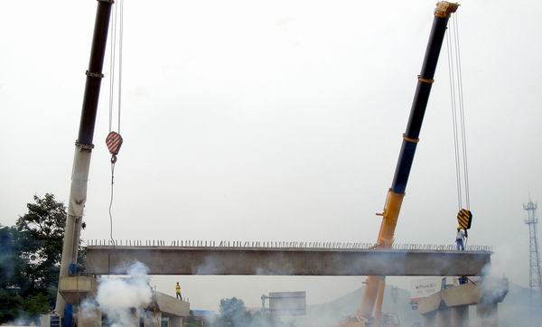 此次梁板架設(shè)方案經(jīng)我部反復(fù)討論,還專門舉行了梁板架設(shè)安全技術(shù)交底會(huì),并上報(bào)了專項(xiàng)技術(shù)和安全方案?,F(xiàn)場(chǎng)吊裝作業(yè)的隊(duì)伍也是我部特別選用的一支有多年梁板架設(shè)經(jīng)驗(yàn)的專業(yè)隊(duì)伍。在抓生產(chǎn)進(jìn)度的同時(shí),確保安全防范及時(shí)跟上。