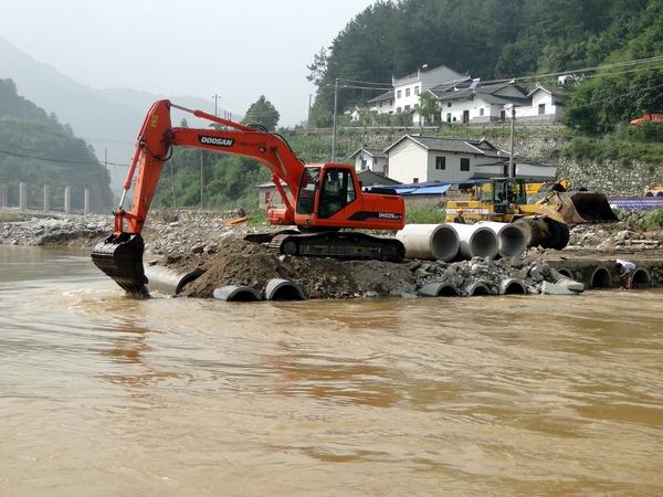 從27日開始,天氣放晴,水位下降,我部抓住機會進行第三次搶修,一臺挖機、一臺裝載機和五臺運輸車同時作業(yè),終于在28日上午打通便橋。項目部迅速組織人員把施工設備、施工材料調(diào)運到對面,28日下午恢復小型結(jié)構物施工。