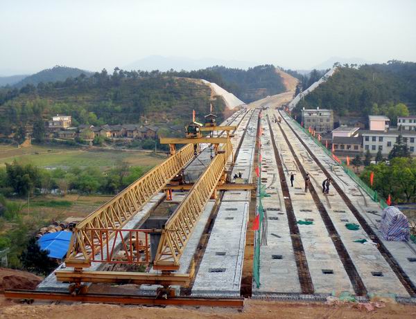 站塘大橋的中心樁號(hào)為K1497+532,全長(zhǎng)306米,共12跨,是我標(biāo)段最長(zhǎng)的一座大橋。上部構(gòu)造為25米預(yù)應(yīng)力箱梁,共96片,下部結(jié)構(gòu)共有樁基52根、蓋梁26片。站塘大橋的梁板是從2號(hào)梁場(chǎng)運(yùn)過(guò)來(lái)的。在運(yùn)梁過(guò)程中,由于遇到連陰雨天氣,導(dǎo)致道路潮濕,不能承受梁板的重量。針對(duì)這種情況,項(xiàng)目部積極開(kāi)拓思路想辦法,不等不靠,通過(guò)用碎沙石鋪出一條道路來(lái)保證運(yùn)梁不受影響。在春節(jié)復(fù)工后,項(xiàng)目部又加大人力物力投入。架梁過(guò)程中,橋梁技術(shù)人員始終堅(jiān)守在施工一線,做好分部分項(xiàng)技術(shù)交底和安全防護(hù)工作,保證了架梁的進(jìn)度、質(zhì)量和安全。