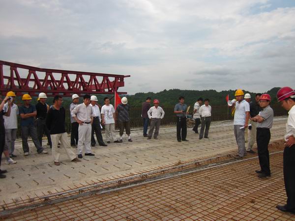 下午15:30,在大廣高速龍楊段項目辦、高駐辦相關(guān)領(lǐng)導帶領(lǐng)下,全線各高駐辦、施工單位主要負責人徒步參觀了我標江口大橋施工現(xiàn)場。實地考察中,我標項目經(jīng)理羅權(quán)針對水混凝土橋面鋪裝施工情況作了簡要介紹,并就部分施工細節(jié)問題與觀摩團進行了深入交流。